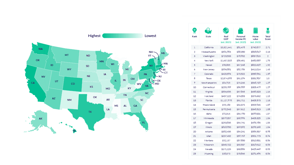 The US remains one of the richest countries in the world, but which state will be the wealthiest over the next decade? To uncover this, we analysed real GDP and personal income per capita over the past 10 years, as well as Zillow home value data over the past 5 years. We then created an index that predicted the economic health of each state in four years, with California coming out on top.